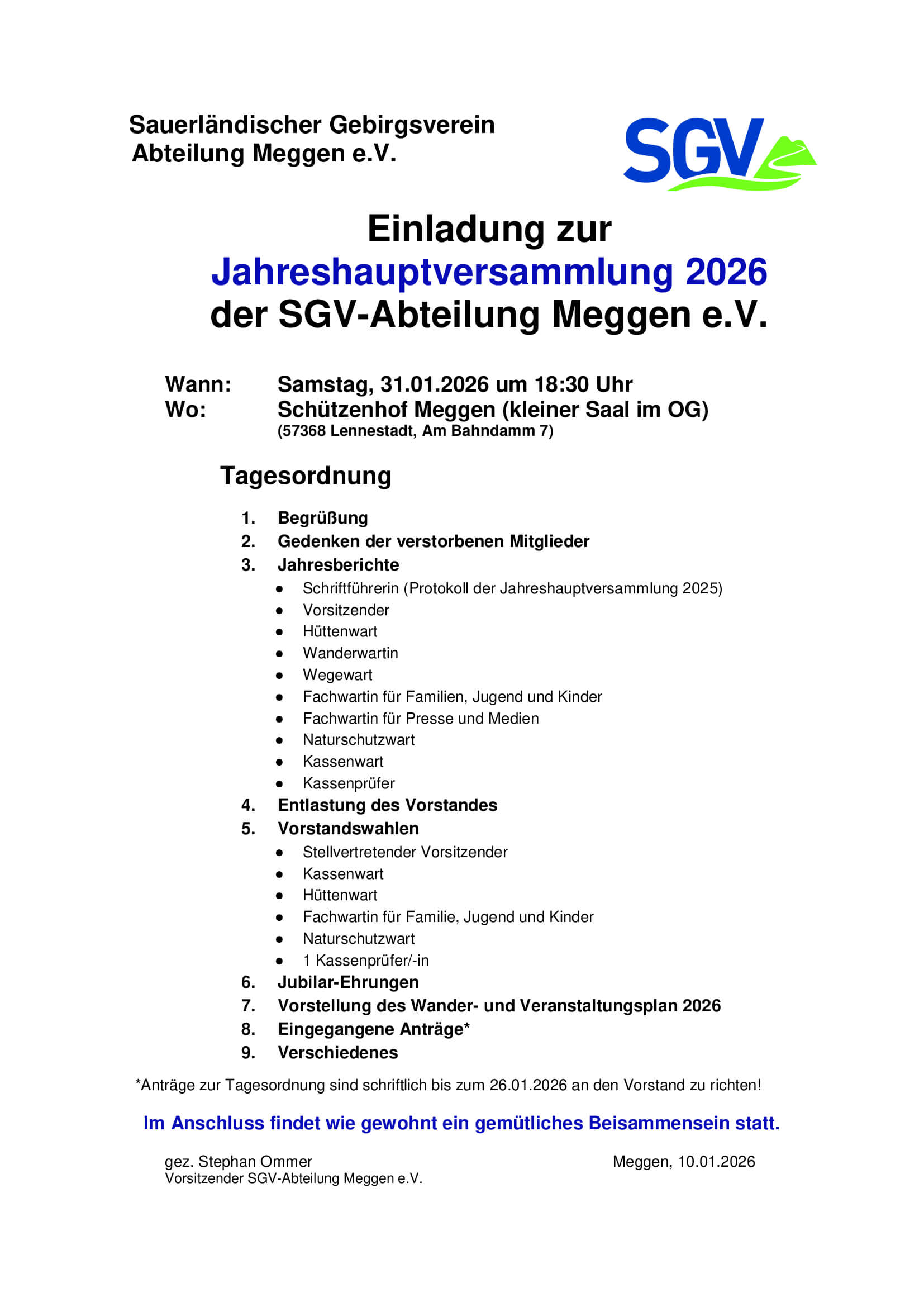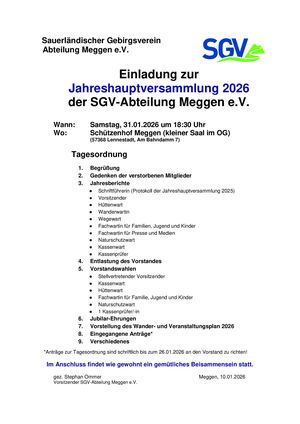Die SGV-Abteilung Meggen lädt hiermit alle Mitglieder herzlich zur Jahreshauptversammlung 2026 ein. Die Versammlung findet am Samstag, den 31. Januar 2026, um 18:30 Uhr im Schützenhof in Meggen statt.